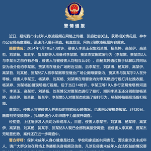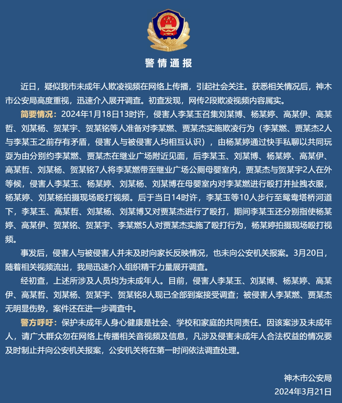 3月21日,陕西神木市公安局发布警情通报:近日,疑似神木市未成年人欺凌视频在网络上传播,引起社会关注。获悉相关情况后,神木市公安局迅速介入展开调查。初查发现,网传2段欺凌视频内容属实。