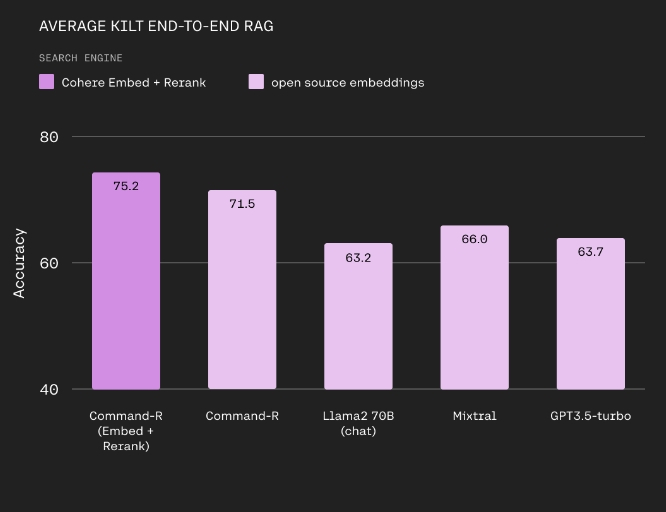 当然,Cohere与OpenAI在技术能力上也有差别。公司在上周发布可拓展生成模型Command-R时,拿来做比较的竞品是Llama 2、Mixtral这样的开源模型,以及GPT3.5-Turbo。