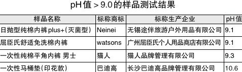 此外,有4款样品的pH值超过9.0,碱度较高,容易引起过敏。涉及Neinei日抛型纯棉内裤plus+(灭菌型)、watsons屈臣氏舒适免洗棉内裤、猫人一次性纯棉平角男士内裤以及巴迪高一次性马桶垫(印花款)。