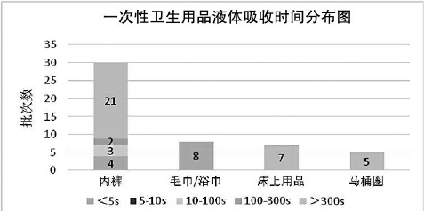 试验发现,不同类别样品吸水性存在差异,一次性毛巾/浴巾吸水最快,用时均小于5秒,表现较好;一次性床上用品和一次性马桶圈的吸水时间均超过300秒;一次性内裤样品中有21款吸水时间超过300秒,4款吸水时间小于5秒,5款在5秒至300秒之间。