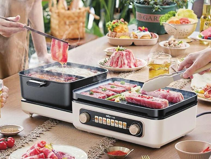 该款多功能锅采用一体成型的设计,整体造型简约大方,线条流畅。锅体采用优质铝合金材质,四层压铸不变形,导热迅速均匀,加热效果更佳。其最大特点就是一锅多用,集涮、煮、煎、烤等多种功能于一体,满足了现代家庭对于烹饪的多样化需求。无论是简单的火锅、炖肉,还是复杂的煎鱼、烧烤,都可以轻松搞定。