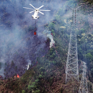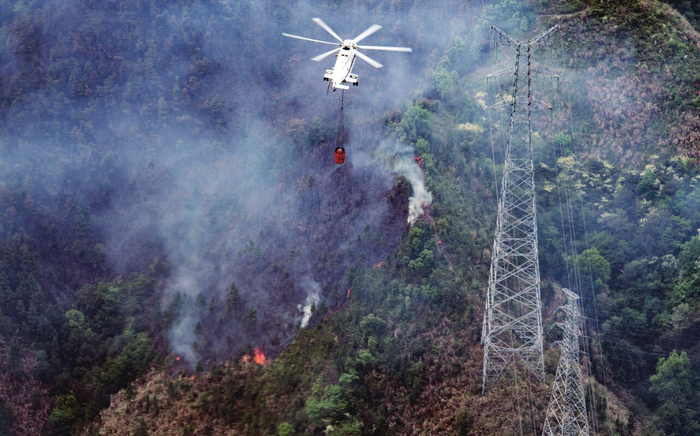 AC313加装消防吊桶,可以载水3吨,可在水深2.5米以上的水源点进行取水,以160千米/时的速度飞往火场上空进行灭火作业。