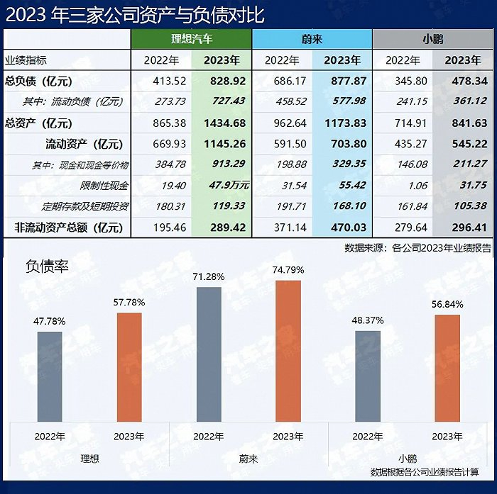 不过,财报的资产负债表里还有更多的“秘密”,其中负债率和流动比率是两个重要指标。三家公司的负债率都比2022年提高了,理想和小鹏的负债率都在55%以上,蔚来则超过了70%。一般而言,一家公司的资产负债率40%-60%的区间较为合适,低于45%的企业偏保守,较高的负债率也意味着公司较为激进。也看几个同行 2023 年Q3的负债率:比亚迪 77%,极氪 123%。