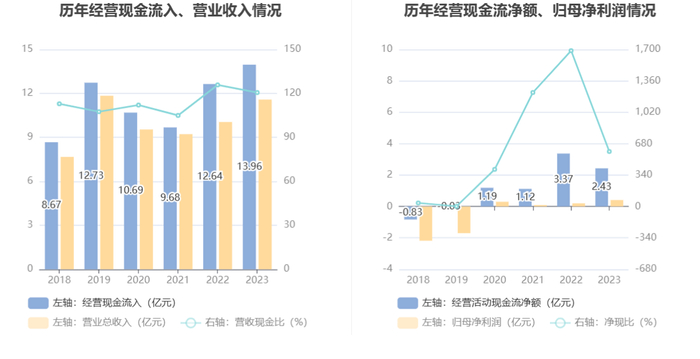 2023年,公司营业收入现金比为120.57%,净现比为594.91%。
