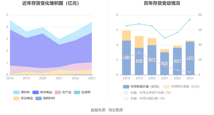 从存货变动来看,截至2023年年末,公司存货账面价值为4.44亿元,占净资产的74.17%,较上年末增加8023.74万元。其中,存货跌价准备为1725.25万元,计提比例为3.74%。