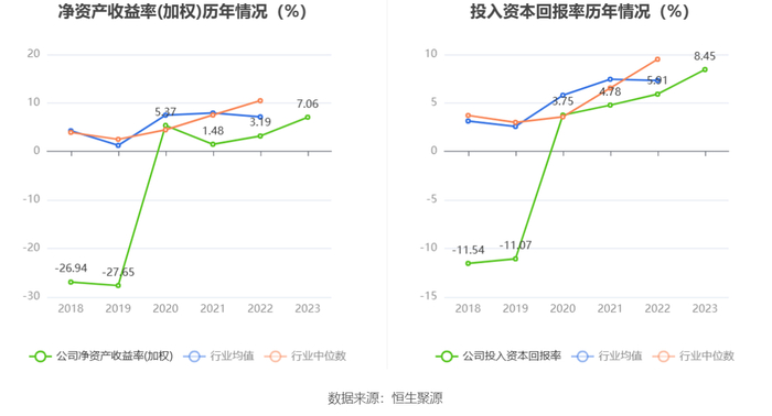 数据显示,2023年公司加权平均净资产收益率为7.06%,较上年同期增长3.87个百分点;公司2023年投入资本回报率为8.45%,较上年同期增长2.54个百分点。