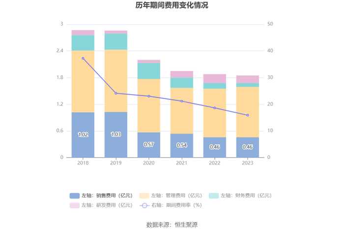 2023年,公司期间费用为1.84亿元,较上年同期减少320.87万元;期间费用率为15.92%,较上年同期下降2.74个百分点。其中,销售费用同比增长0.81%,管理费用同比增长3.34%,研发费用同比下降15.82%,财务费用同比下降32.32%。