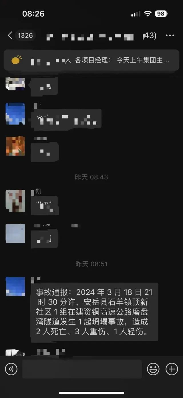 网传聊天记录显示,有人在某群发了一则事故通报,内容为:2024年3月18日21时 30 分许,安岳县石羊镇顶新社区1组在建资铜高速公路磨盘湾隧道发生1起坍塌事故,造成2 人死亡、3 人重伤、1人轻伤。该群聊疑似为某工地项目经理群。