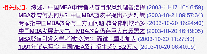 如果仔细研究1997-2022年全国MBA报名人数情况,我们会发现,报名人数在此前的2003和2015年也分别出现了“回调”,而回溯此前MBA遇冷时期的新闻资讯内容我们发现,争议点无不关于“‘MBA=高薪’、“文凭无用”的价值讨论”。