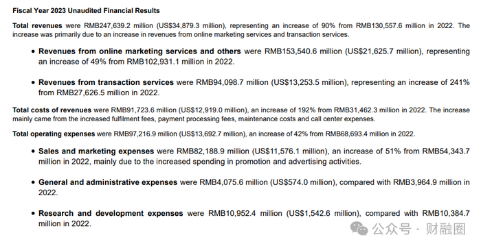 2023年第四季度,拼多多的市场营销费用同比增长50%至266亿元;2023年全年,拼多多的市场营销费用同比增长51%至822亿元,主要由于促销和广告活动增加。