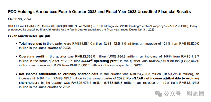 2024年3月20日,拼多多发布2023年第四季度及全年业绩报告。报告显示,2023年第四季度,拼多多实现营收889亿元,同比增长123%,大幅超出市场预期的798亿元;归属于拼多多普通股股东的净利润233亿元,同比增长146%。