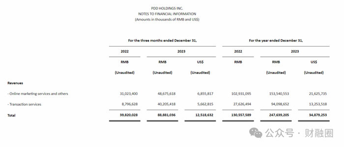 从拼多多的收入构成来看,2023年第四季度,拼多多来自在线营销服务及其他服务的收入为487亿元,同比增长57%;来自交易服务的收入为402亿元,同比大增357%。2023年全年,拼多多在线营销服务及其他服务收入为1535亿元,同比增长49%;来自交易服务收入941亿元,同比增长241%。