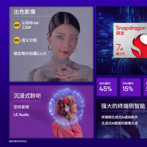 为打造卓越的娱乐性能,第三代骁龙7+支持部分Snapdragon Elite Gaming的全新特性,包括游戏后处理加速器和Adreno图像运动引擎2.0,从而增强游戏效果并将游戏的视效提升至端游级水平。此外,该平台支持行业领先的18-bit认知ISP,带来顶尖影像特性。