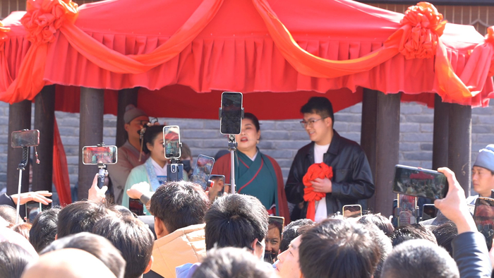 下午15时许,乔妆打扮后的赵梅手持红绣球,穿过拥挤的人群,上台表演。