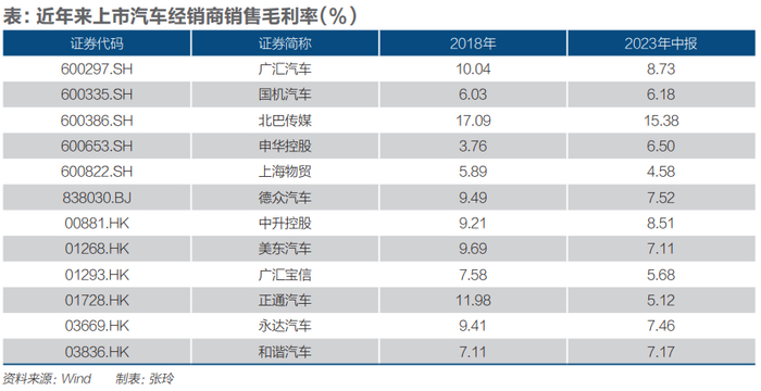 盈利能力下滑,是上市汽车经销商近年来面临的普遍现状。万得(Wind)数据显示,相对于2018年,12家上市汽车经销商中,有9家公司2023年上半年销售毛利率下滑。其间,正通汽车(01728.HK)毛利率由11.98%降至5.12%。