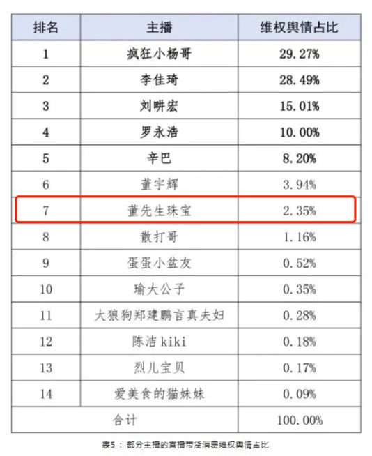 经过汇总分析舆情数据,在2022年直播带货消费维权舆情信息中,上述报告选取疯狂小杨哥、李佳琦、刘畊宏、罗永浩、辛巴、董宇辉、董先生、散打哥、蛋蛋小盆友、瑜大公子、烈儿宝贝、爱美食的猫妹妹等14位主播作为重点分析对象。其中,董先生珠宝以2.35%的维权舆情占比排第七。