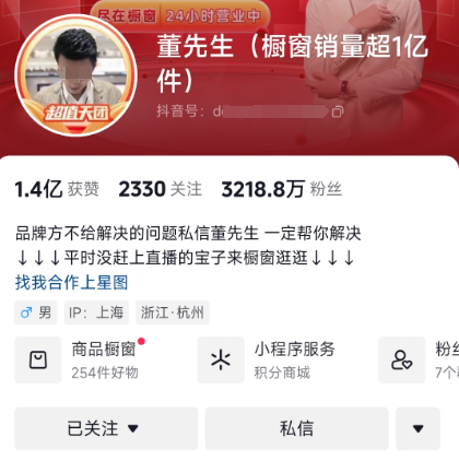 董先生已是某短视频平台多次霸榜的超头部现象级带货主播。目前某短视频平台粉丝数为3218.5万人。