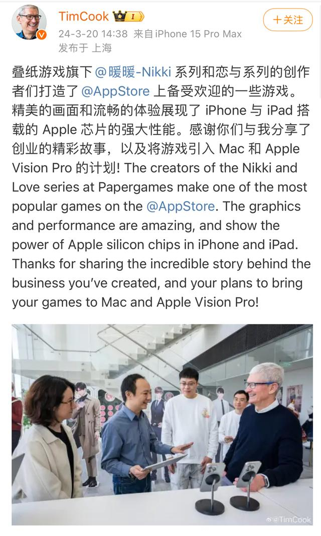 库克在微博分享造访叠纸游戏