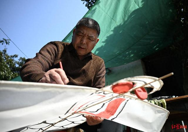 3月21日,61岁的高加辉坐在金鸡工艺风筝厂的小院里,正低头为一只传统金鱼造型的金鸡风筝上色,只见他用毛笔勾勒出鱼身,而后换红色颜料涂抹鱼鳞,“金鸡风筝以红、黄、绿、黑为主色,造型常见的有金鱼、燕子、龙等图案,纯手工制作而成。”在他的记忆里,最高纪录一天画了1000多支风筝。这周末,他将带着他的风筝,“出战”风筝大赛。