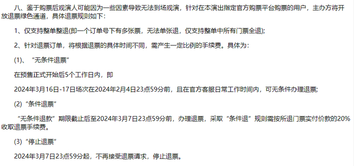 对此,大麦相关人员称,2023年9月《关于进一步加强大型营业性演出活动规范管理促进演出市场健康有序发展的通知》发布后,大麦积极督促主办方,按新要求落实退票政策,5000人以上大型商业演出活动全部依规实行梯次退票政策。针对政策范围之外的演出活动,凡主办方明确支持退票的,大麦会按照项目规则给予退票退款处理;针对不可退项目,则会在演出售票页给予显著提醒,避免消费者误购导致损失。如用户确实有特殊情况提出退票诉求,大麦也会尽全力沟通主办方协商,最终以主办答复结果为准。