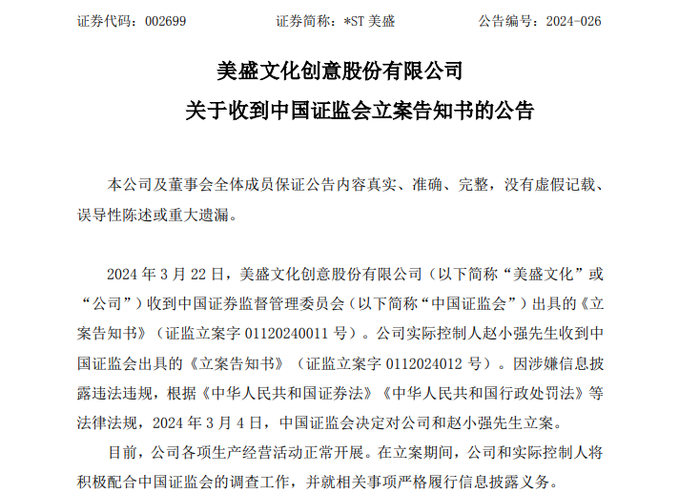 继2023年11月收到证监会罚单后,*ST美盛(002699 )及其实控人赵小强再遭立案调查。3月22日晚间,*ST美盛发布公告,因涉嫌信息披露违法违规,中国证监会已于2024年3月4日决定对公司及赵小强立案调查。公司表示,目前各项生产经营活动均正常开展,后续将积极配合调查工作,并就相关事项履行信息披露义务。