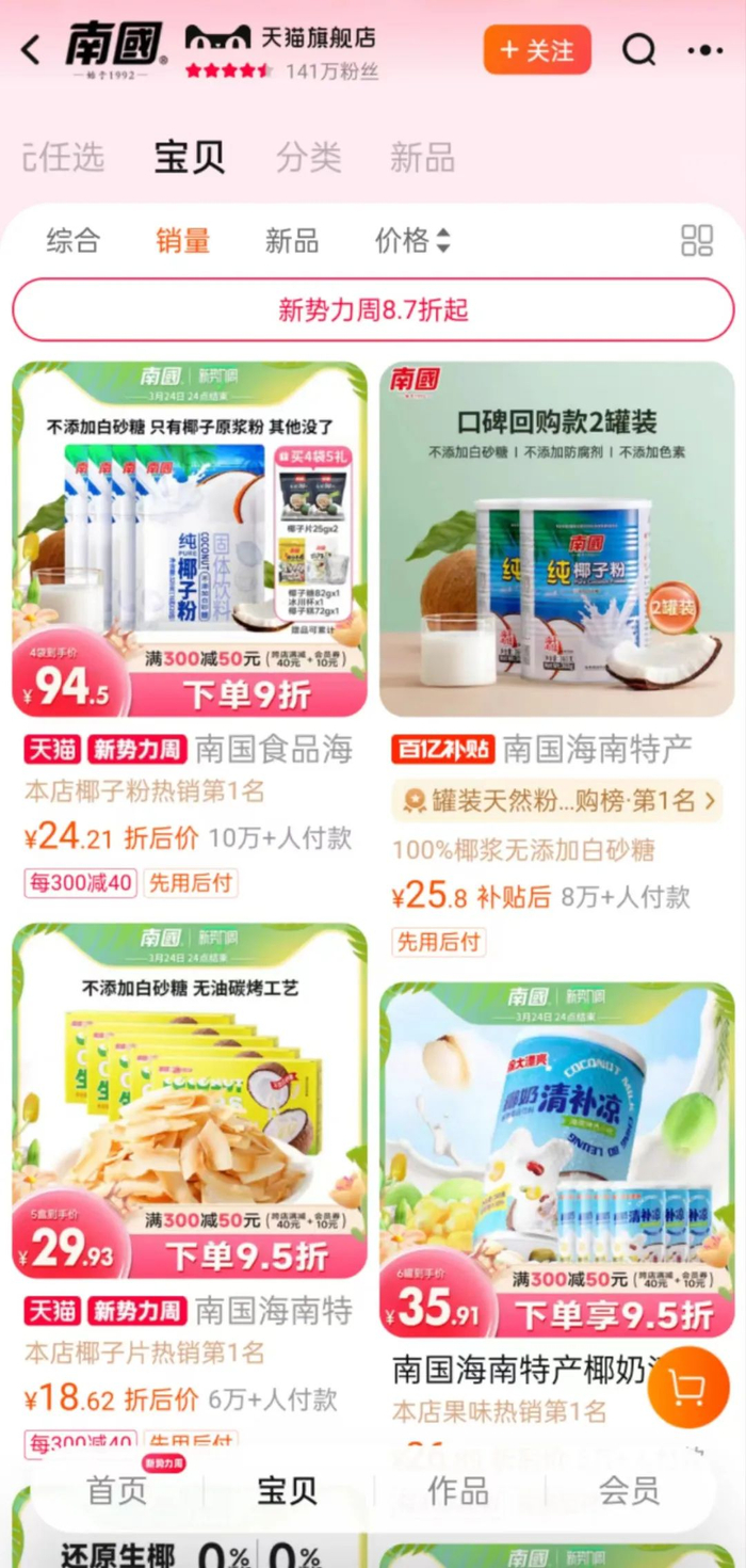 其中,纯椰子粉产品销售最火爆,据南国天猫旗舰店数据,纯椰子粉速溶冲饮袋装产品全网销量超过20万件,罐装销量也超过了10万件,休闲食品香脆椰子片销量也超过9万件。