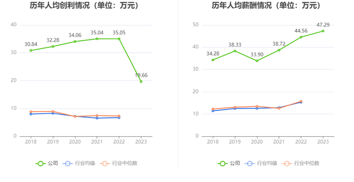 截至2023年末,公司员工总数为240人,人均创收455.25万元,人均创利19.66万元,人均薪酬47.29万元,较上年同期分别变化-16.04%、-43.91%、6.13%。
