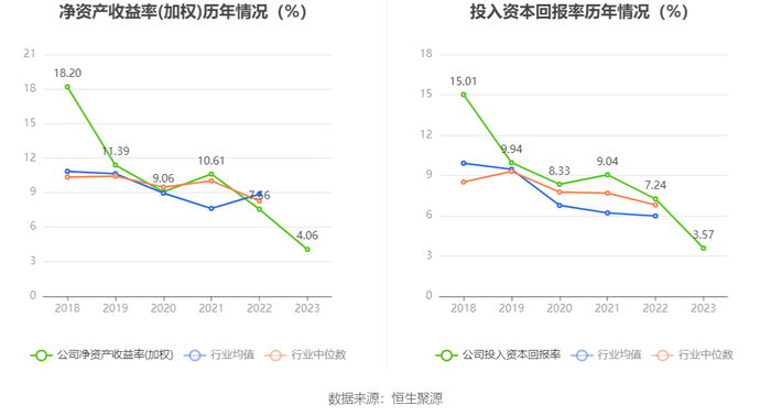 数据显示,2023年公司加权平均净资产收益率为4.06%,较上年同期下降3.50个百分点;公司2023年投入资本回报率为3.57%,较上年同期下降3.67个百分点。