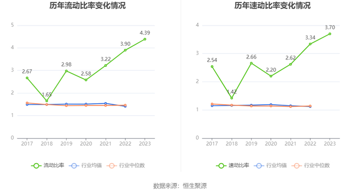 2023年,公司流动比率为4.39,速动比率为3.70。