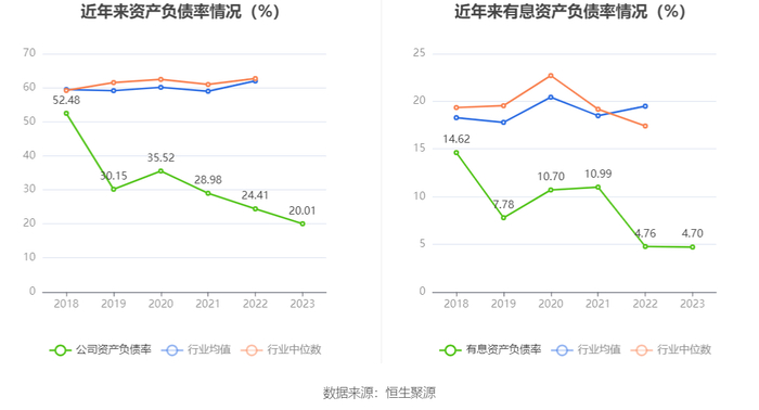 在偿债能力方面,公司2023年年末资产负债率为20.01%,相比上年末下降4.40个百分点;有息资产负债率为4.70%,相比上年末下降0.06个百分点。