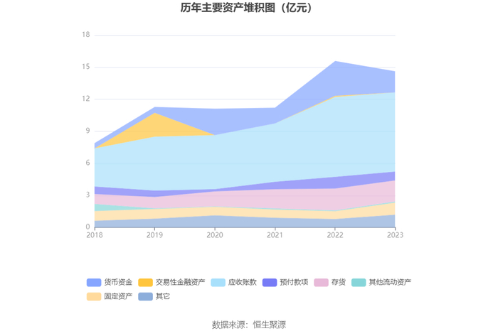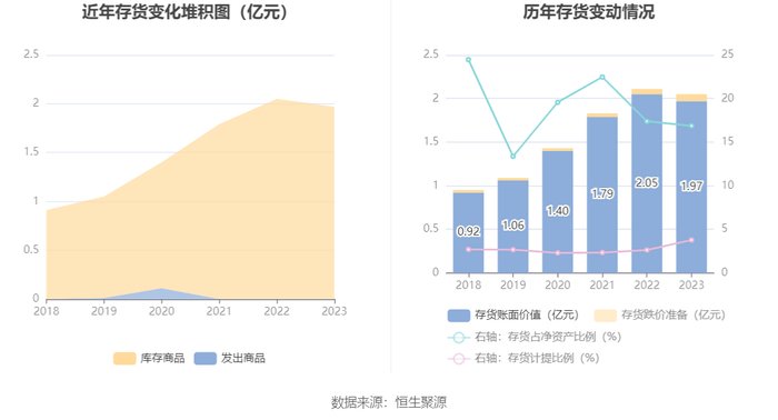 从存货变动来看,截至2023年末,公司存货账面价值为1.97亿元,占净资产的16.87%,较上年末减少794.91万元。其中,存货跌价准备为771.16万元,计提比例为3.77%。