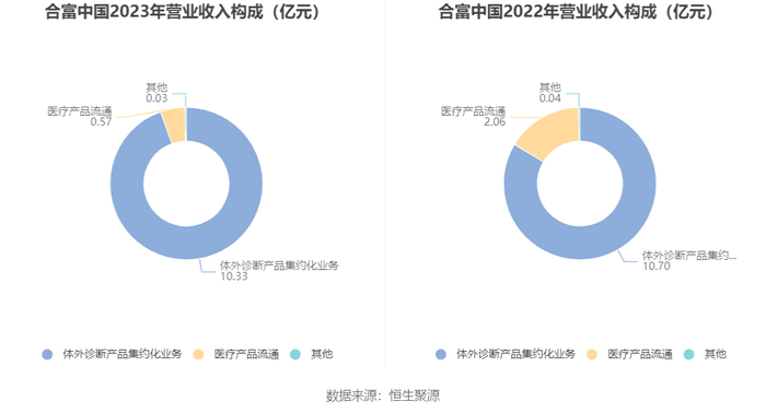 分产品来看,2023年公司主营业务中,体外诊断产品集约化业务收入10.33亿元,同比下降3.46%,占营业收入的94.56%;医疗产品流通收入0.57亿元,同比下降72.13%,占营业收入的5.26%。