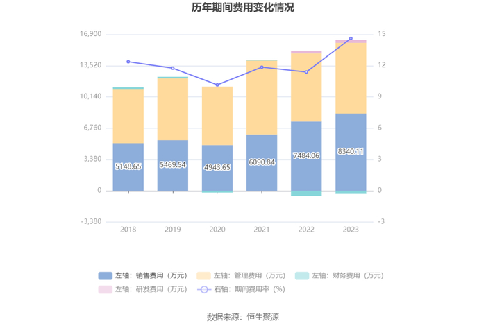 2023年,公司期间费用为1.60亿元,较上年同期增加1389.24万元;期间费用率为14.61%,较上年同期上升3.22个百分点。其中,销售费用同比增长11.44%,管理费用同比增长3.77%,研发费用同比增长13.7%,财务费用由去年同期的-550.38万元变为-333.33万元。
