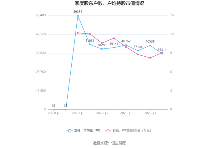 筹码集中度方面,截至2023年年末,公司股东总户数为3.53万户,较三季度末下降了5227户,降幅12.89%;户均持股市值由三季度末的8.25万元上升至9.07万元,增幅为9.94%。