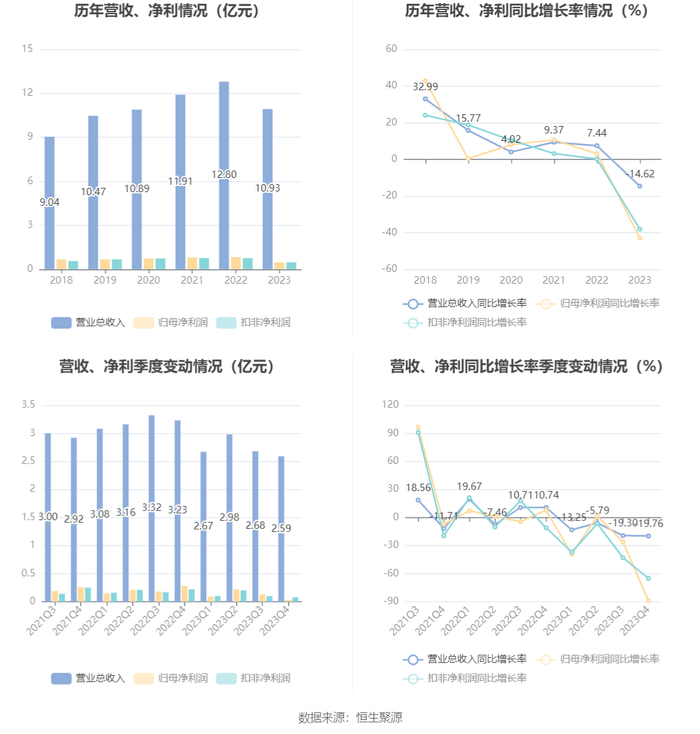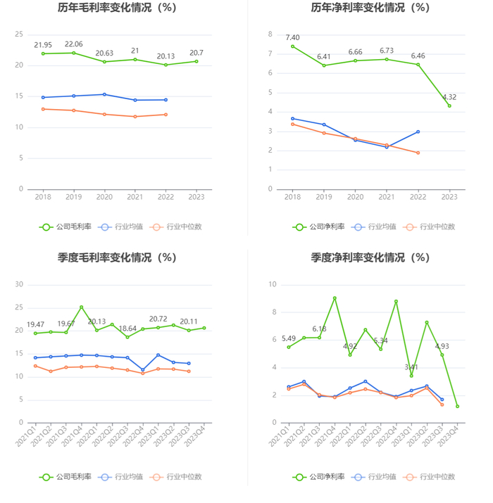 2023年,公司毛利率为20.70%,同比上升0.57个百分点;净利率为4.32%,较上年同期下降2.14个百分点。从单季度指标来看,2023年第四季度公司毛利率为20.64%,同比上升0.23个百分点,环比上升0.53个百分点;净利率为1.20%,较上年同期下降7.61个百分点,较上一季度下降3.73个百分点。