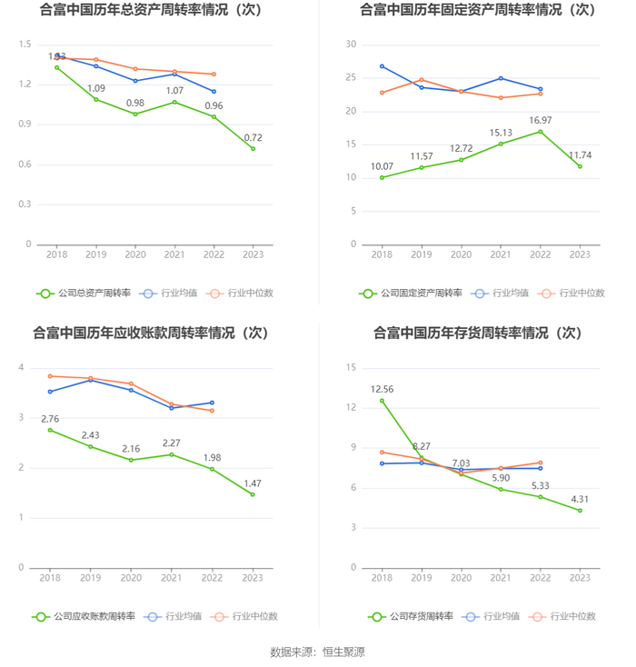 营运能力方面,2023年,公司公司总资产周转率为0.72次,上年同期为0.96次(2022年行业平均值为1.15次,公司位居同行业17/24);固定资产周转率为11.74次,上年同期为16.97次(2022年行业平均值为23.38次,公司位居同行业16/24);公司应收账款周转率、存货周转率分别为1.47次、4.31次。