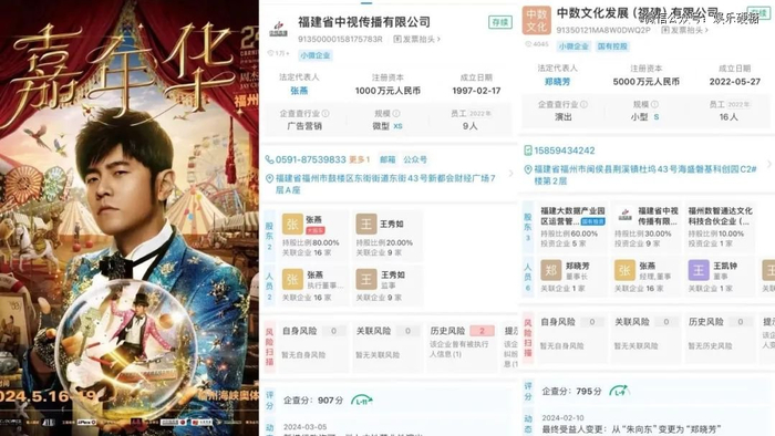 比如周杰伦2024年福州演唱会的主办方是福建省中视传播有限公司,这家公司的大股东张燕是福建国有资本控股的中数文化发展(福建)有限公司董事。