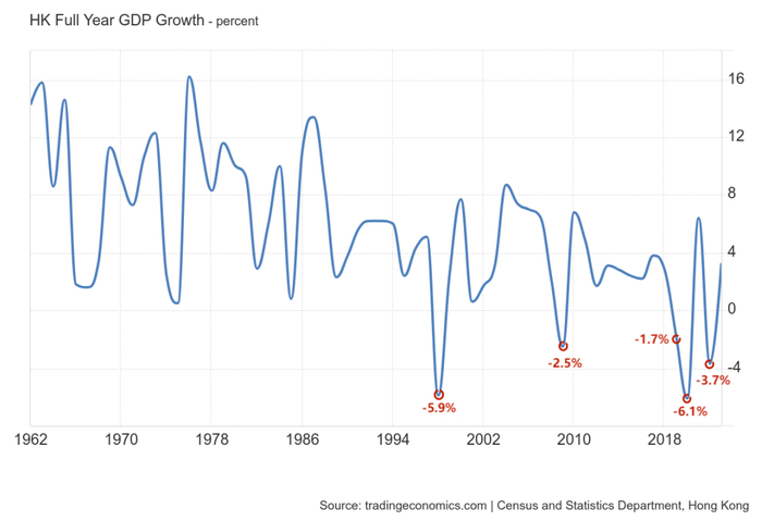 而GDP负增长在2019年之前的香港,只发生过两次:1997年金融危机之后的1998年,以及2008年金融危机之后的2009年。
