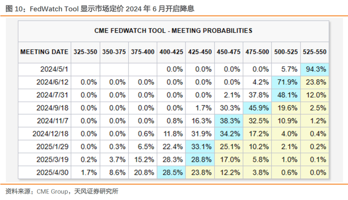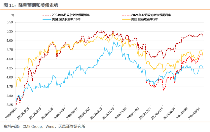 影响降息进程的关键则是美国经济韧性。结合前述分析,美国就业、通胀超预期,但消费边际走弱、通胀在油价二轮效应影响过峰后也可能存在超预期波动。