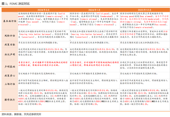 2024年3月FOMC决议表述相比1月有三点关注: