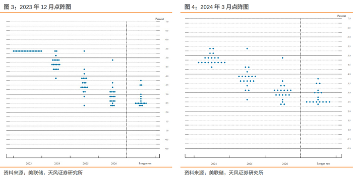 第二,物价预测小幅上调,2024年核心PCE同比中位数上调0.2个百分点至2.6%,2025年PCE同比中位数上调0.1个百分点至2.2%,二者均回到2023年9月预测水平。