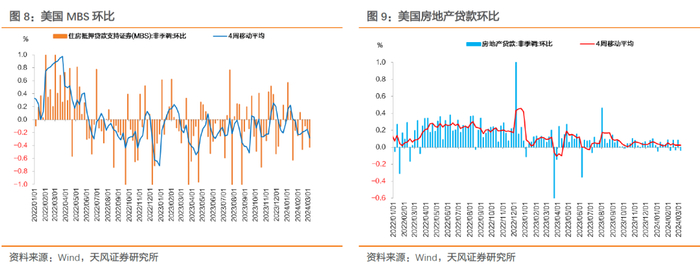 第三,信贷高频数据显示美国地产供需也在降温。住房抵押贷款支持证券(MBS)环比持续位于负区间,房地产贷款环比相比2022-2023年显著走弱、扩张乏力。地产是利率敏感部门,近期高频数据表明高利率对地产供需的影响可能进一步显现。持续的高利率环境下,地产上下游将有越来越多主体面临更高的再融资成本。