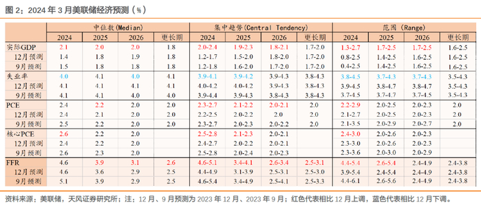 第一,经济预测显著上调,与去年12月相比,3月议息会议对2024-2026年GDP增速预测的中位数分别上调0.7、0.2和0.1个百分点至2.1%、2.0%、2.0%;2024年和2026年失业率预测中位数均小幅下调0.1个百分点至4.0%。