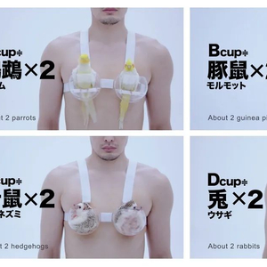 在一个男人胸前戴上四种不同的小动物。
