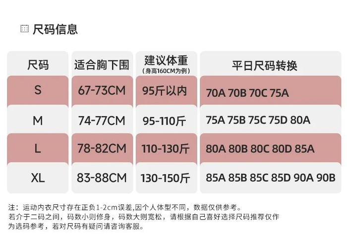 共有S/M/L/XL四个码数,从A罩杯到D罩杯都可以穿着无忧。
