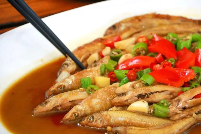 鲜辣可口的红烧船钉鱼是桐庐的特色美食。船钉鱼,桐庐又叫“棍子鱼”,个头小但鲜味足。