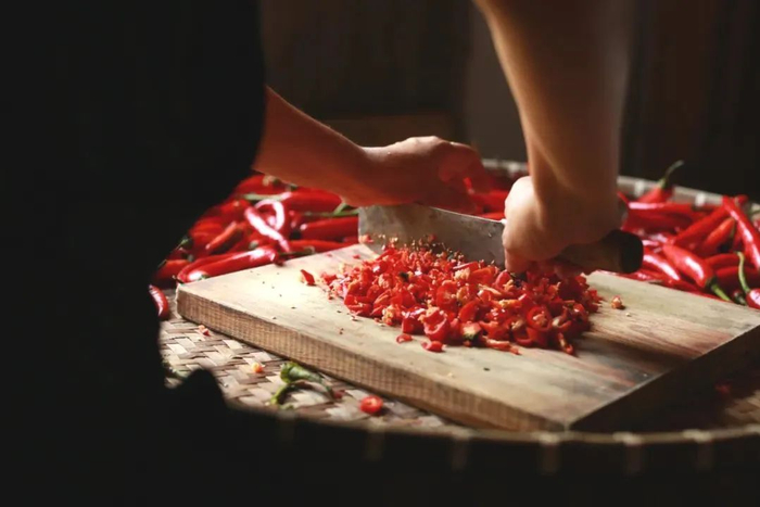 湖山酱坚持传统手作腌制,新鲜辣椒洗净去蒂、手工剁碎,剁好后与适量的盐、糖、蒜等调料混合均匀,最后再装入瓶中,倒些许特制白酒密封保存。这样制作出来的辣椒酱不仅色泽鲜红、口感醇厚、辣而不燥,而且易于保存,香而不腻。