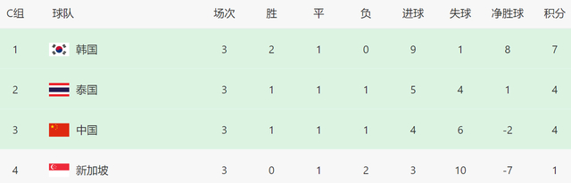 在目前的C组积分榜上,泰国队积4分,和中国队一样,但净胜球为1个、中国队则是-2个,落后泰国队3球。
