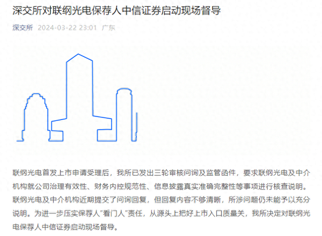 深交所指出,为进一步压实保荐人“看门人”责任,从源头上把好上市入口质量关,决定对联纲光电保荐人中信证券启动现场督导。