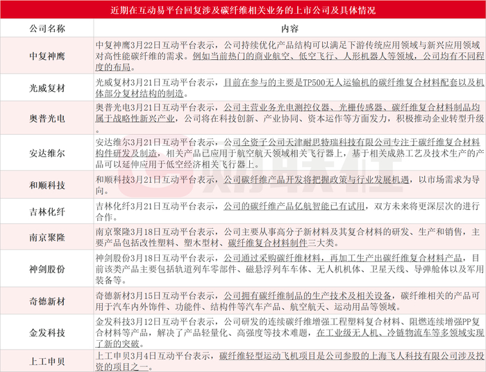 此外,据财联社不完全整理,近期在互动易平台回复涉及碳纤维相关业务的上市公司包括中复神鹰、光威复材、奥普光电、安达维尔、和顺科技、吉林化纤、南京聚隆、神剑股份、奇德新材、金发科技和上工申贝,具体情况如下图:
